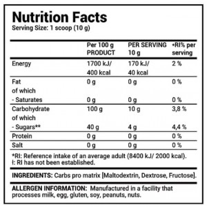 Mélangez 1 portion (10 g) de Carbs Pro Matrix avec 250 ml d'eau froide. Comme complément alimentaire, prenez une dose 30 minutes avant ou pendant votre entraînement. Il nécessite une consommation quotidienne pour obtenir un effet maximal.
